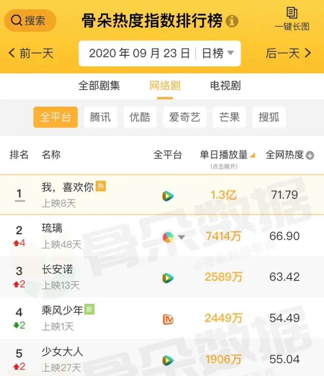 從某平台的全網熱度指數排行榜中可以看到,在9月23日,《我喜歡你》以單日點播量1.3億的數字在全平台遙遙領先,可謂是一騎絕塵。