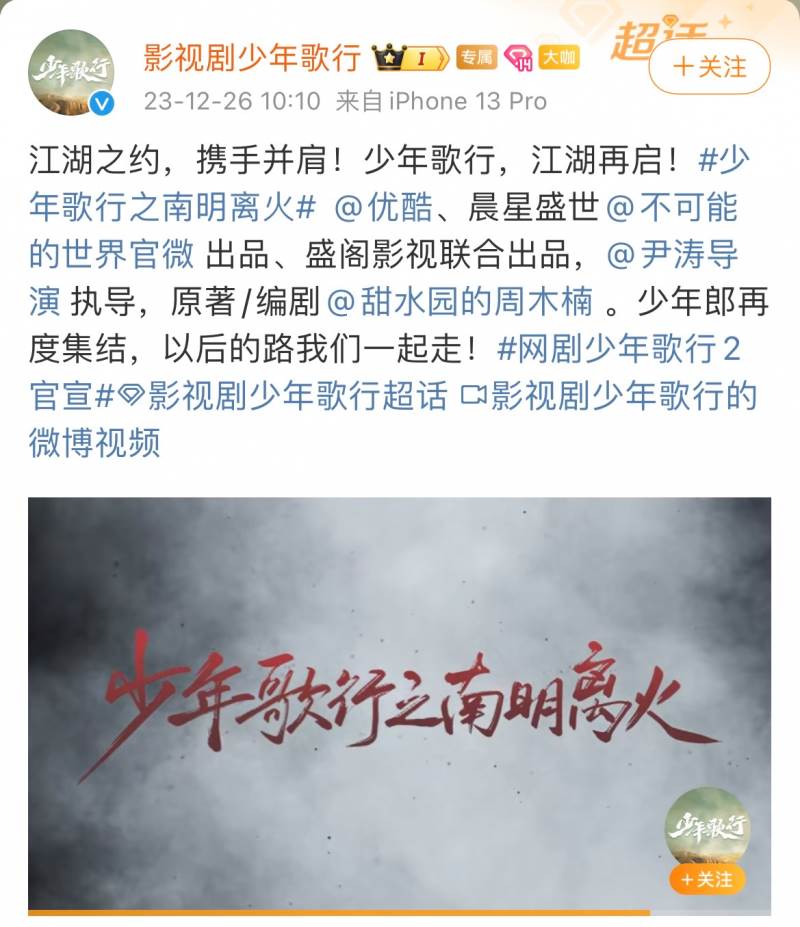 目前第二部的名字已經確定,《少年歌行之南明離火》,至于劇情,很多人根據原著猜測可能會圍繞著已經登基的蕭崇的噩夢開展。蕭崇成為天正帝之后,噩夢纏身,小神醫說是心病,也就是說他對在軍方和朝堂都有巨大影響力的蕭楚河可能依然耿耿于懷。
