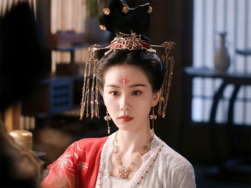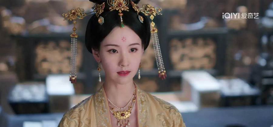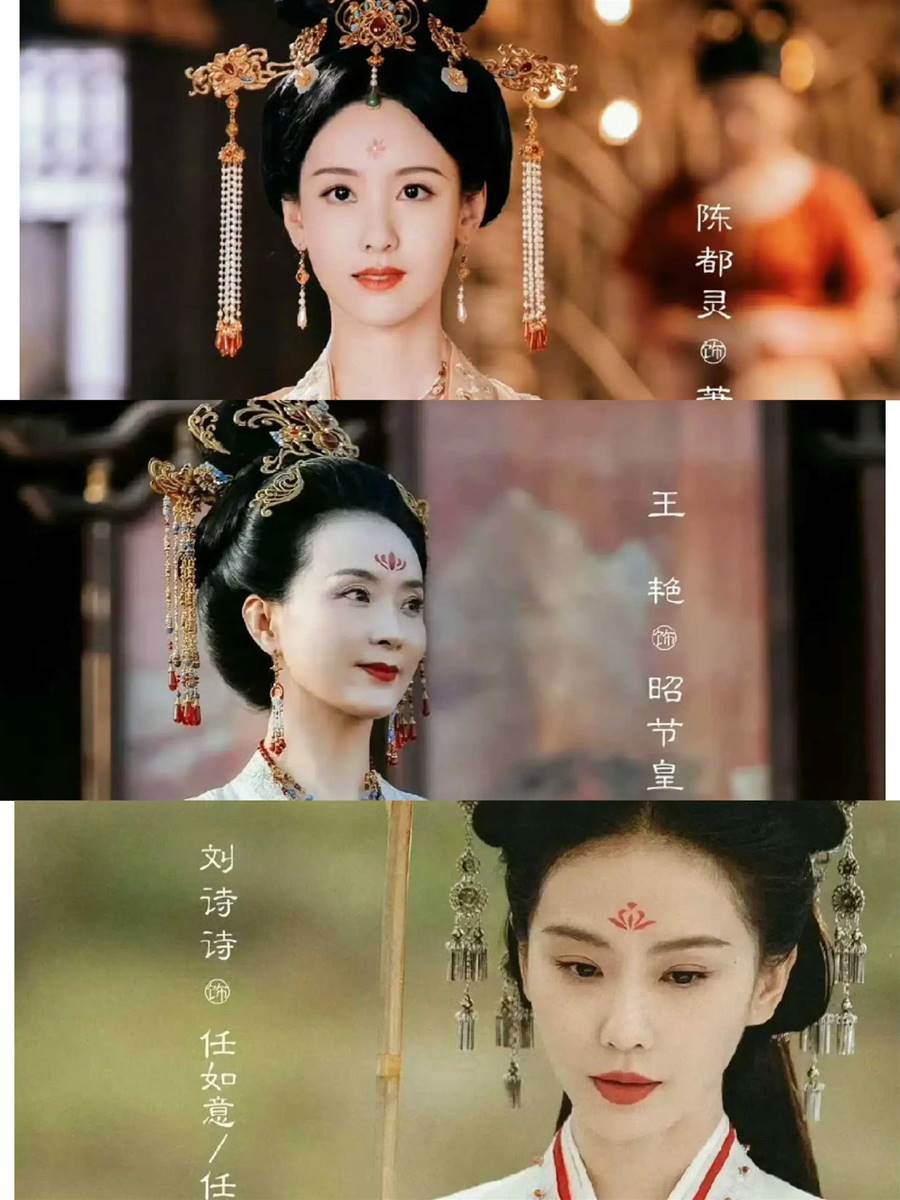 劇中陳都靈和王艷飾演的皇后角色分別用了珍珠步搖和鎏金步搖,又用鬢釵修飾兩鬢。劉詩詩則用了錯落的垂珠簪。這三人額間都有花鈿,還是花朵造型,不同的是,陳都靈還多加了珍珠。 這些細微之處,足以可見劇組的用心。