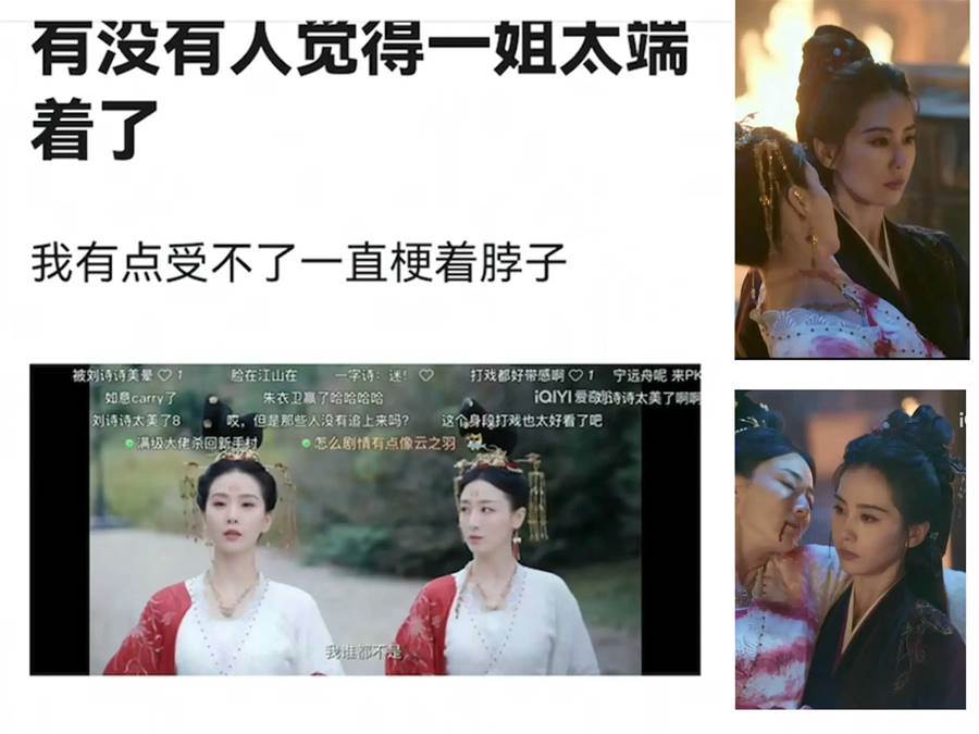 不過,在大批夸贊聲中也有不少爭議。首先就是劉詩詩的儀態,有人說她太端著了,老是梗著脖子,劇中她抱葉青的那一段戲,脖子保持90度一動不動,看著像極了「端王」宋焰。其次就是該劇涉及到了朝堂和權謀的戲份。按照以往的劇集來看,古偶碰權謀非常危險,很容易撲街,好在《一念關山》有江湖武俠的部分,可以挽救一下。