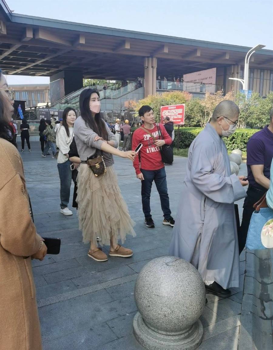 第三張是一張遠景,王祖賢站在人群中沒有明星架子,她前面是一位僧人,由此判斷,這次王祖賢現身南京,有可能是去禮佛的。