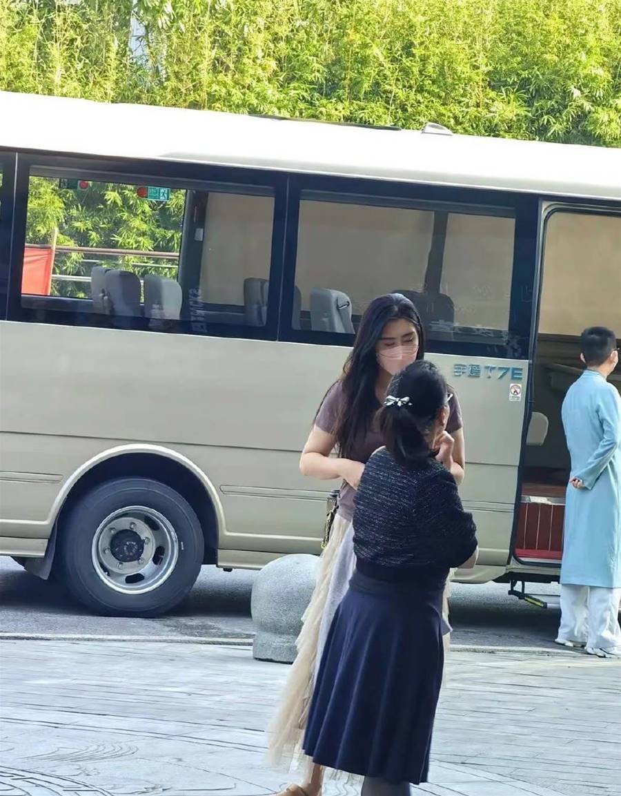 另一張照片,王祖賢在中巴車前和另一個人聊天,一頭濃密的秀發甚至會讓年輕人羨慕,王祖賢172cm的身材相當高挑,和身邊的女士交談甚至要低下頭,這也彰顯了她的平易近人。