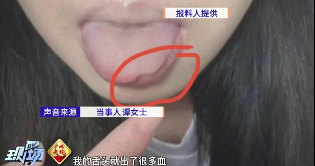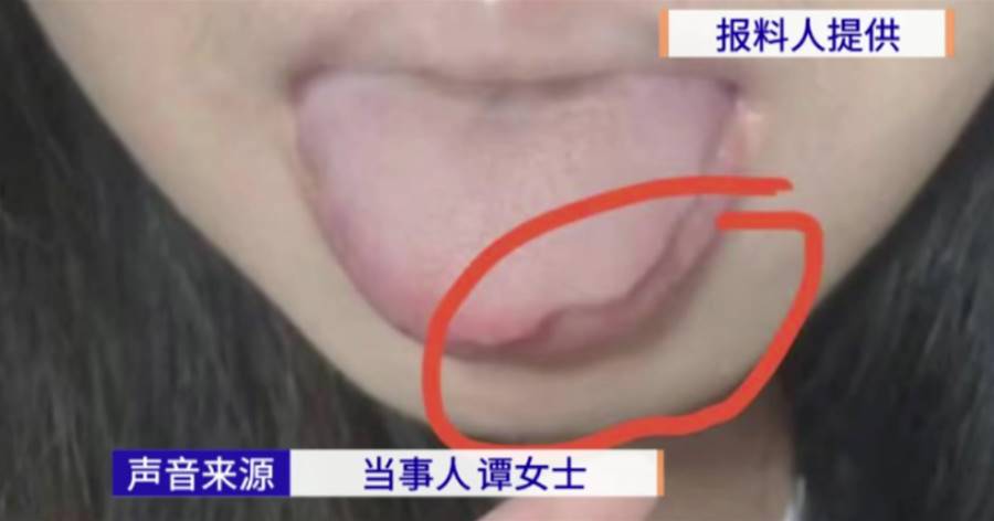 據當事人譚女士提供的視訊可見,她將舌頭伸出來后,舌尖位置確實有明顯的缺失(局長os:看著挺疼的……)。