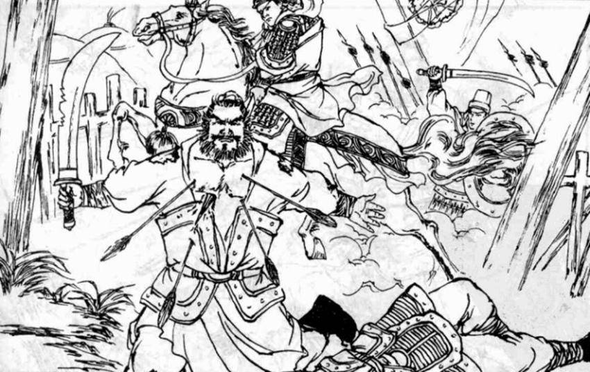 騎兵方退,步軍又到,兩邊槍如葦列。典韋身無片甲,上下前后身中數十槍,猶自大叫死戰。腰刀都砍得不能用了,典韋棄刀,雙手挾兩個士兵迎戰,擊殺八九人。張繡軍被典韋嚇破膽,不敢再接近轅門,于是亂箭齊發,箭如雨密,典韋尚有一口氣在,猶在寨門死守。但寨后騎兵涌入,用長槍攻擊典韋后背,典韋大叫數聲,血流滿地而死。半晌無一人敢從門前而入。
