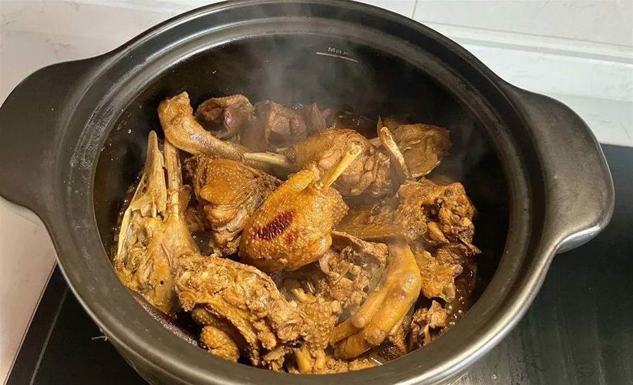 5.倒入米酒,加入適量的鹽、生抽、老抽和冰糖,煮至鴨肉熟透即可。