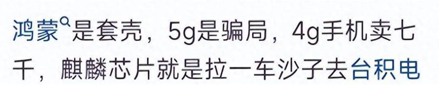 還會有噴子出現,給出無腦答案:鴻蒙是殼子,5G是騙局,4G手機賣7千,麒麟芯片只是給台積電拖一擔沙子。