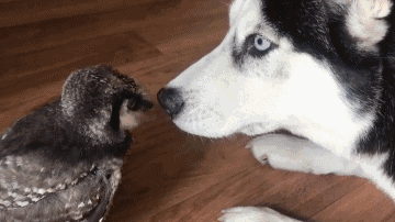 小貓頭鷹一臉不爽,你是什麼東西,也配聞我,啊嗚一口啄住哈士奇的鼻子。
