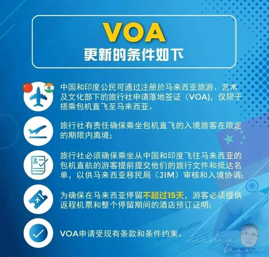最初,落地簽證(VOA)僅適用于經由新加坡、泰國、印度尼西亞和文萊等第三國入境馬來西亞的中國和印度公民,前提是他們持有相關國家的有效簽證。在經過了緊密的討論協商后,內政部稍早前(KDN)已正式發出正式通知。