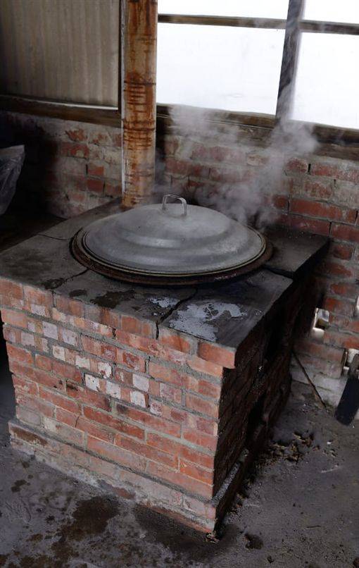 從照片可見,這個古早味十足的灶台,是以一塊塊的紅磚堆砌而成的!而放置在上的大鐵鍋,似乎正燒著滾燙的熱水。儘管隔著螢幕也彷彿能感受到那緩緩上升的水蒸氣~