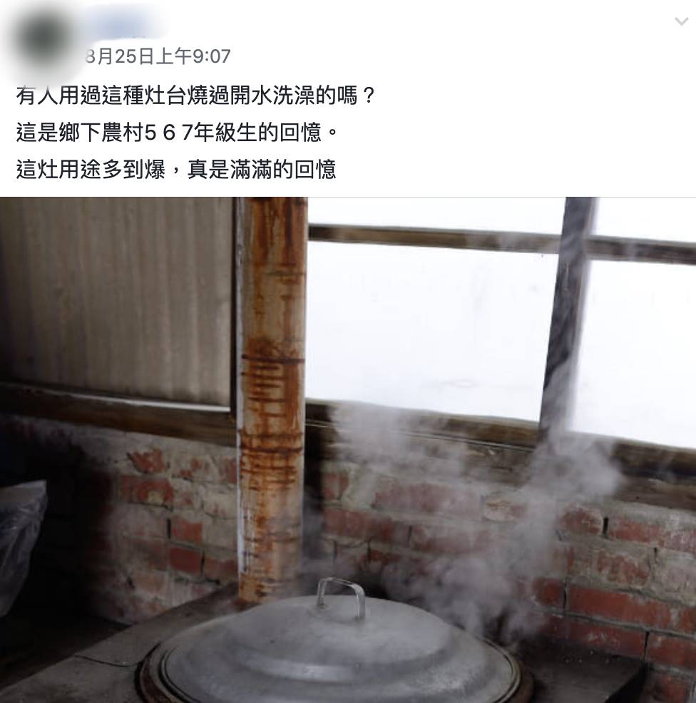 根據三立新聞網報導,這位女網友在臉書社團「蘆竹南崁資訊大小事分享團」Po出一張古早味十足的照片,並笑問:「有人用過這種灶台燒過開水洗澡的嗎?」