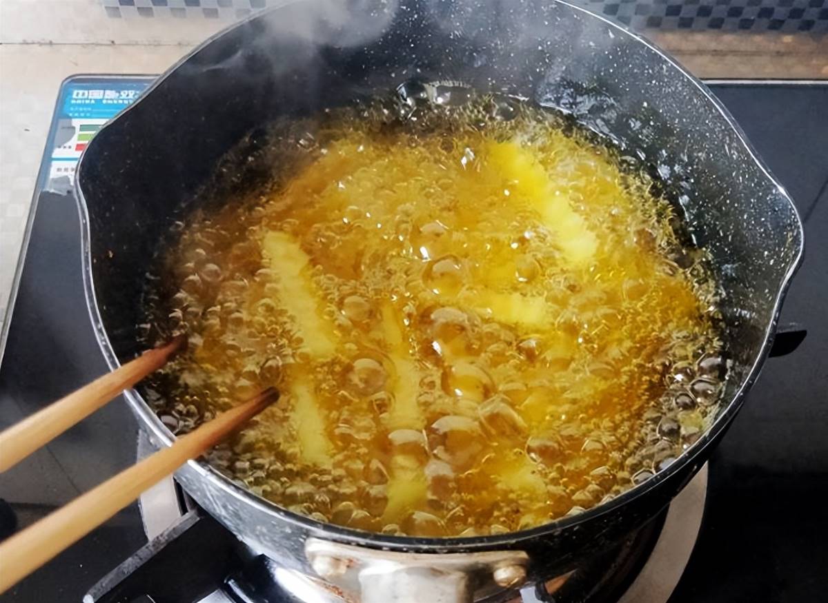 接下來就是烹飪的部分了。首先,我們起鍋燒油,油可以稍寬一些,等油溫達到七成熱時,就可以下入我們已經準備好的土豆了。在炸的過程中,我們需要時不時地翻動土豆,確保每一面都能炸到,直到它們都變得金黃色,然后就可以出鍋了。將炸好的土豆撈出,瀝干油,待用。