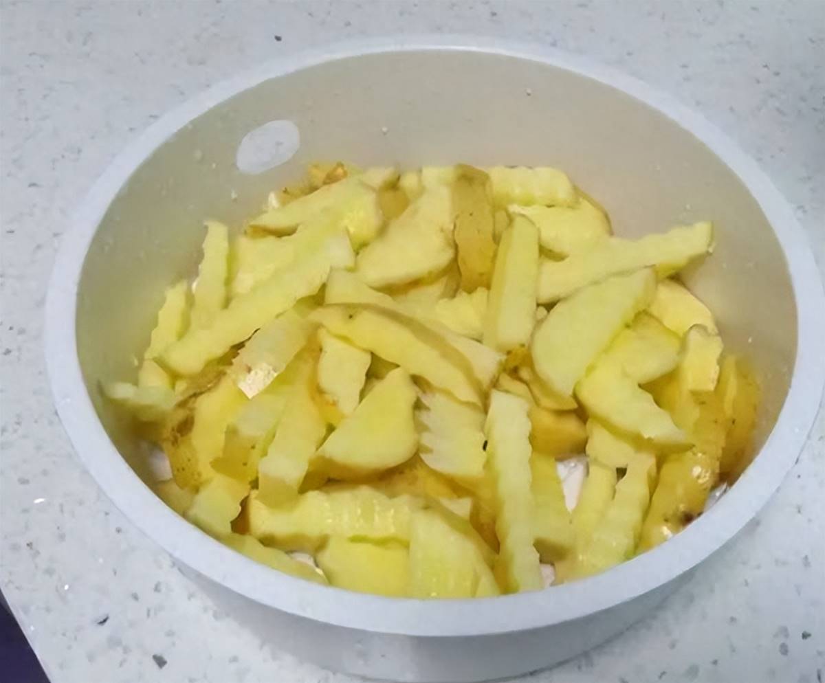 接下來,我們用波紋刀將土豆切成狼牙狀。這個步驟需要一些耐心和技巧,但只要稍加練習,相信你一定能切出漂亮的狼牙土豆。切好后,再次清洗,然后放入涼水中浸泡一會兒。這樣可以使土豆更加緊實,不易碎掉。