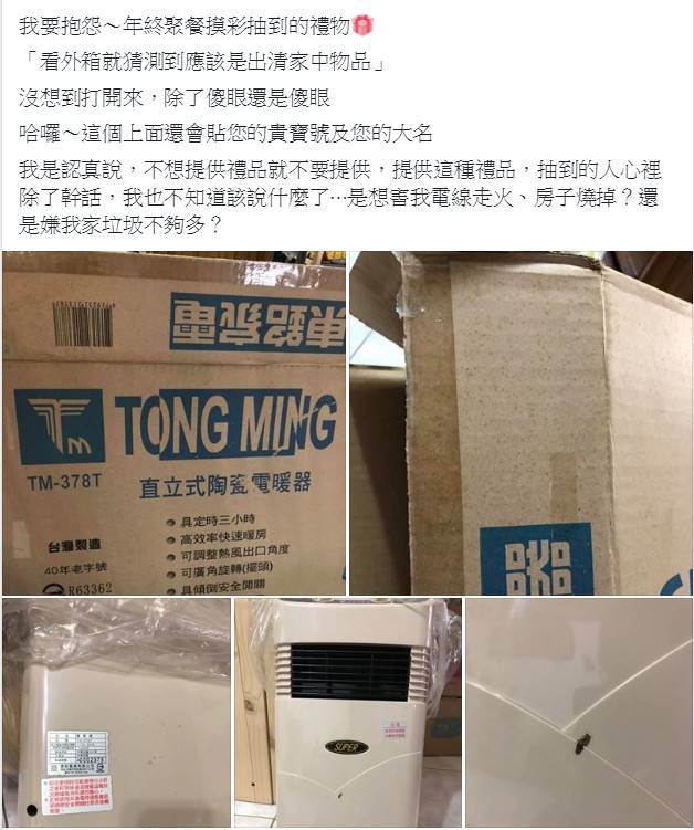 原來這個超大的獎品,就是一台大型電暖器,原本網友看到後,都紛紛恭喜:「其實算不錯的禮物啦!」、「雖然今年冬天還沒冷到,不過也難說之後會不會變冷,算是有用的禮物!」不過原PO分享電暖器的背面之後,讓大家都氣噗噗了!