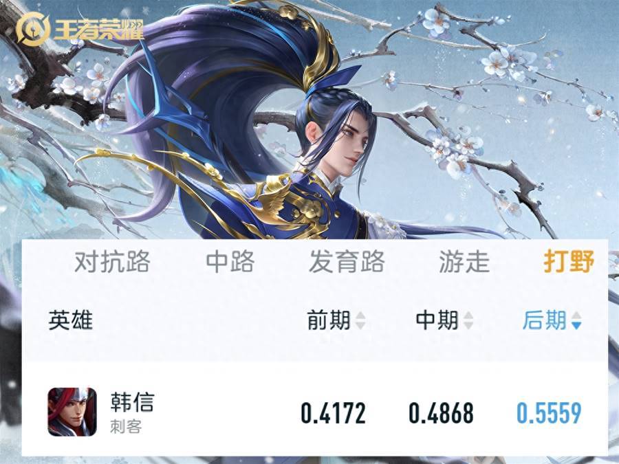 意外嗎?營地的勝率高達55.59%,但你知道前中期韓信的勝率有多高嗎?分別是41.72%和48.68%,相比之下,后期的韓信勝率算得上是暴漲了。