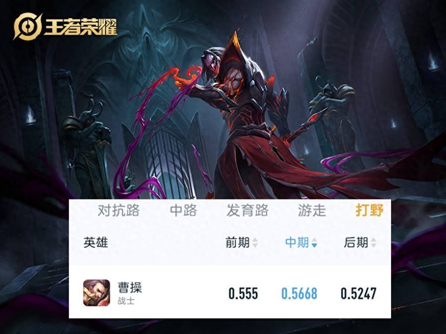 營地勝率56.68%,曹操最強的階段還是中期,可即便是前期和后期,他的勝率單獨拿出來不說是頂尖,也是其他英雄眼中的佼佼者,因為勝率都太高了。