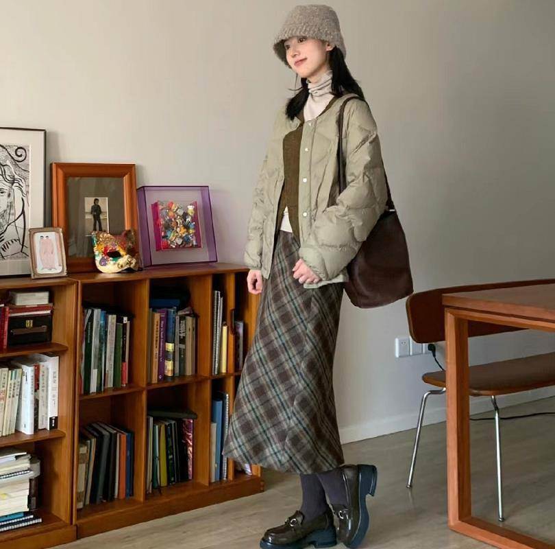灰綠色系的穿搭復古又溫柔,這一件菱格薄款羽絨服,很適合南方的冬季,輕便又溫暖,內搭高領打底+羊毛馬甲,很協調的復古感。下身搭配格紋半身裙+皮鞋,乖巧又不失溫柔。