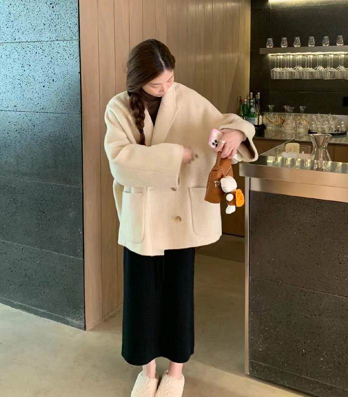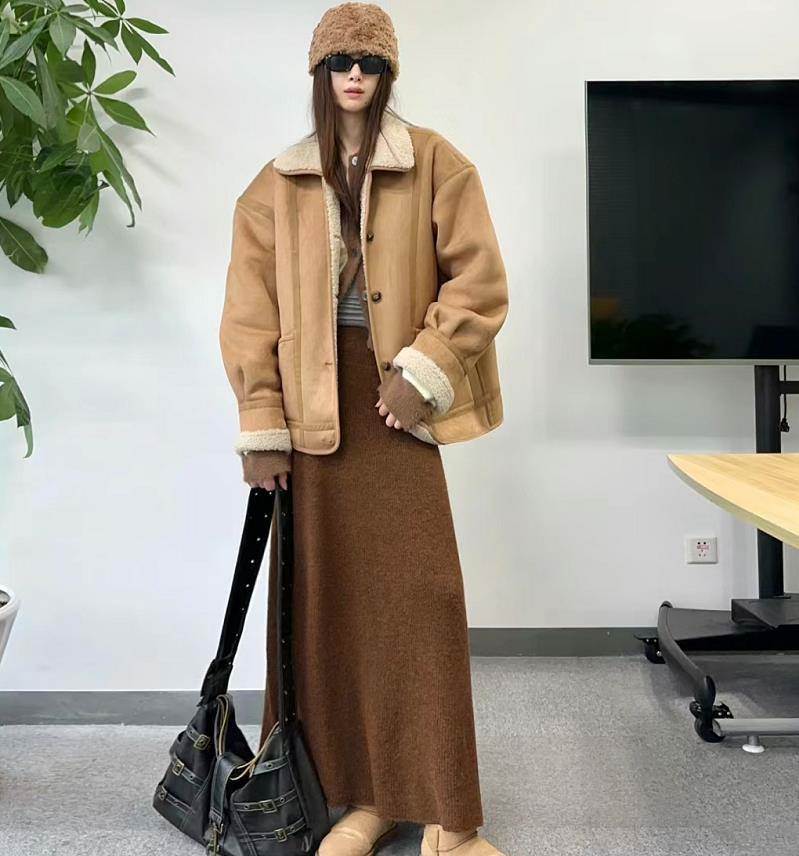 濃濃的復古風穿搭,喜歡的姐妹就學起來,羊羔毛外套在冬天就是很實穿,抗風又保暖,下身搭配的半裙是針織面料的,裙子長度到腳踝,真的擋風又藏肉。