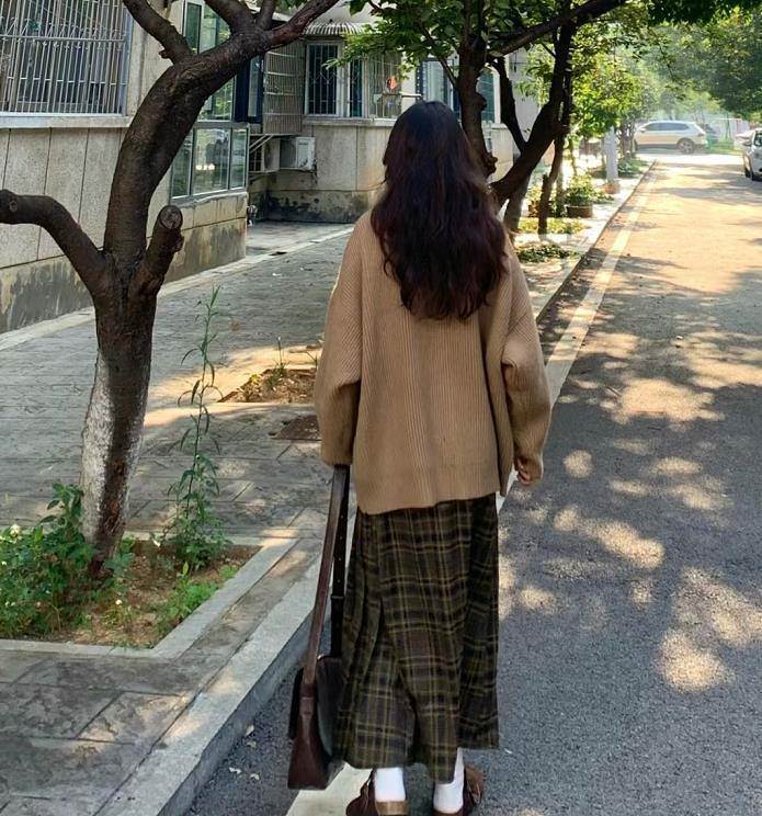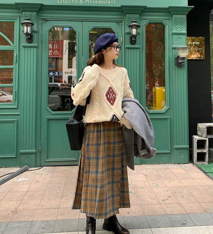 這套也太復古了吧,毛衣的顏色奶呼呼的,穿起來很保暖,單穿或者內搭都行。下身選擇的是格紋半身裙,復古俏皮感拉滿。