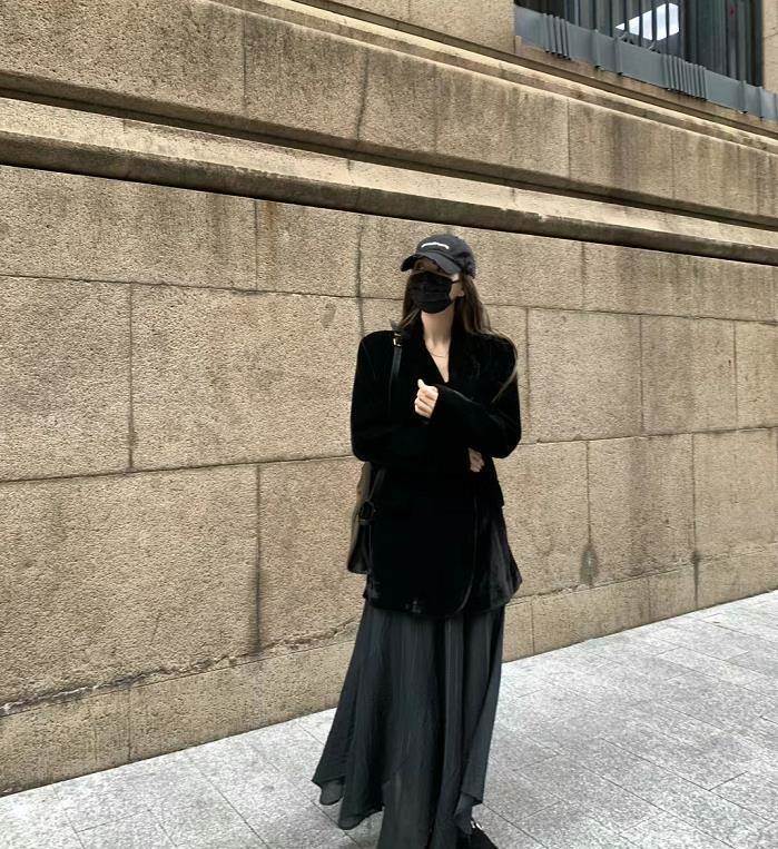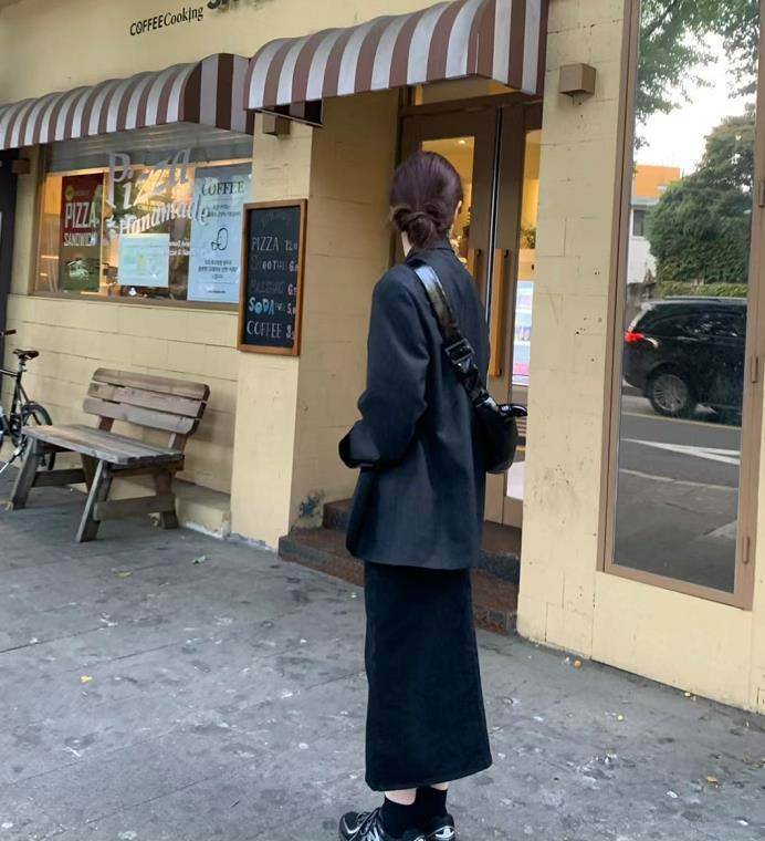 淺色西裝外套+黑色西裝半裙,深淺的對比,層次感十足,結合一雙運動鞋來配,又為整個著裝增添了幾分休閑氣息。