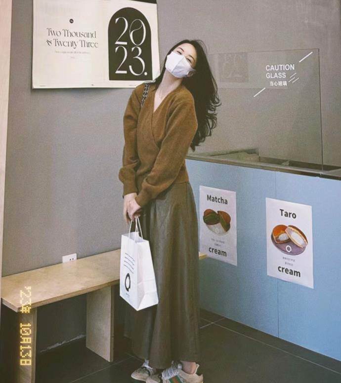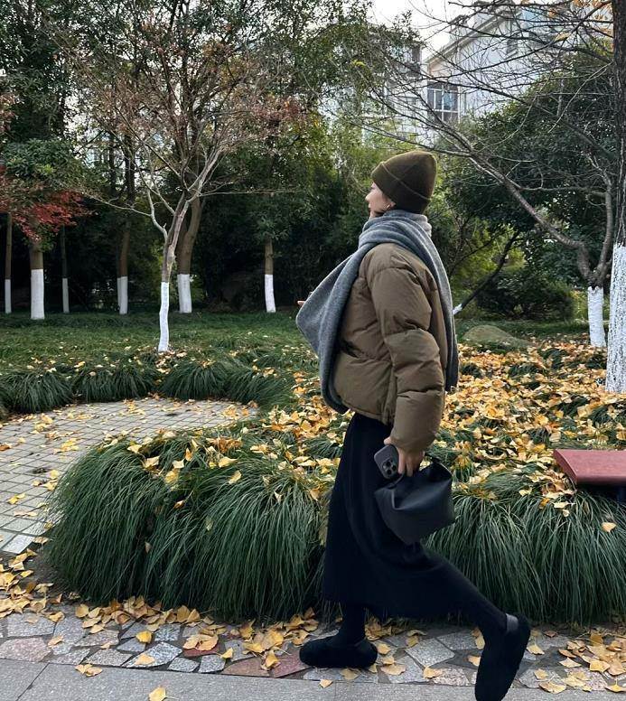 大冬天的南方女孩,該怎麼穿?面包服+針織半裙,保暖又輕便,因為下身是深色的,在視覺上有著瘦身的效果,很藏肉顯瘦。