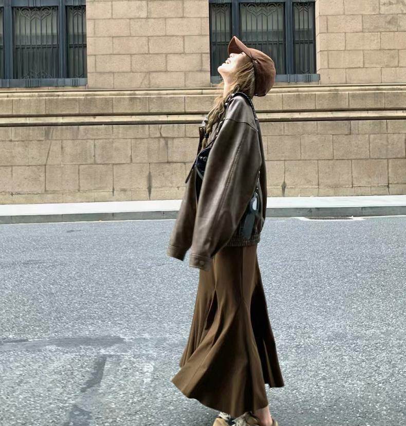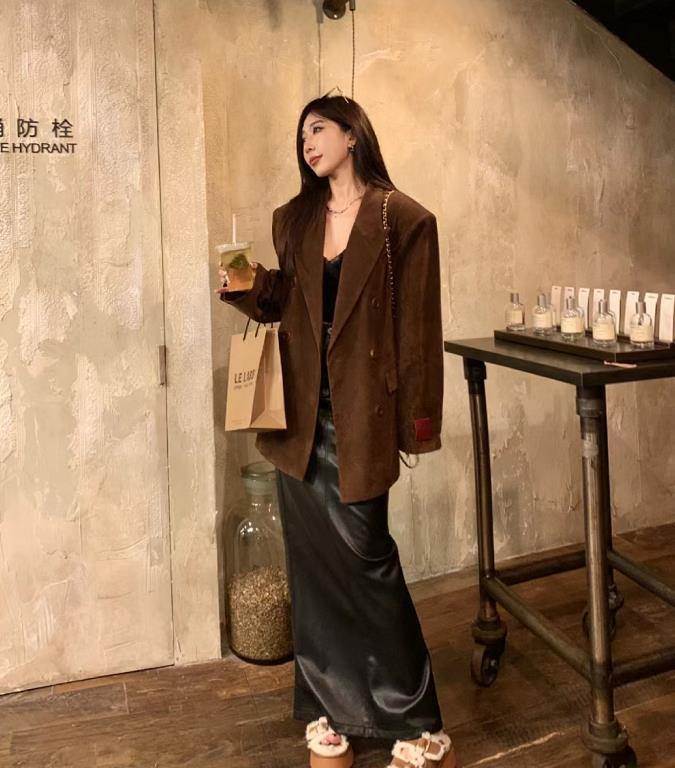 棕色西裝+黑色半身裙,真的既有美貌又溫暖,既不失氣質又干練,還帶著一點點酷颯,可通勤可逛街約會。
