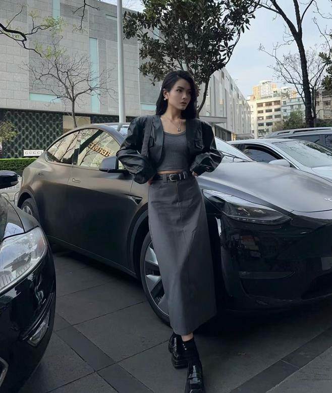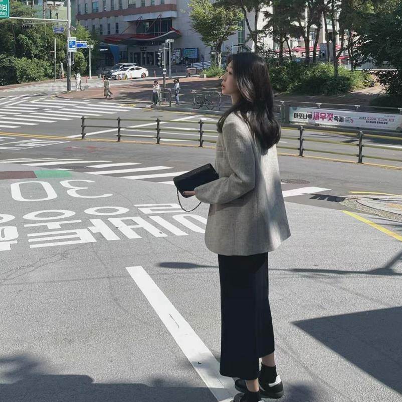 灰黑的配色可是很耐看高級的,怎麼搭都不出錯,這一套運用的是上短下長的組合,優化身材比例,還能拉長腿部線條。