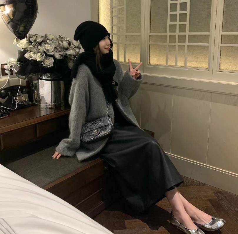 灰色+黑色的配色,真的最時髦高級了,耐看且不出錯,灰色兔毛外套,穿起來也非常保暖,搭配黑色半身皮裙,怎麼都穿不膩。