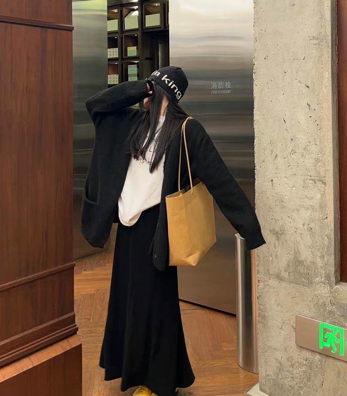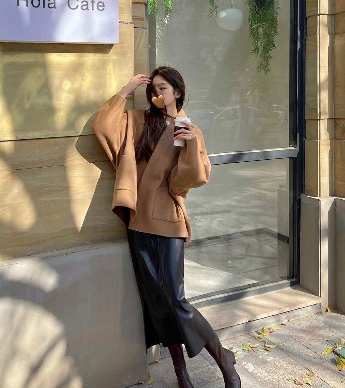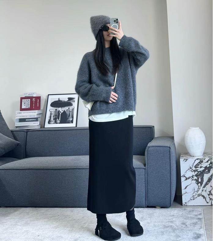 對這種黑色直筒針織半裙真的沒有抵抗力,適合各種身材穿,顯瘦效果可不是一般的好。上衣是一件淺色毛呢外套,寬松的版型,更是藏肉和包容。