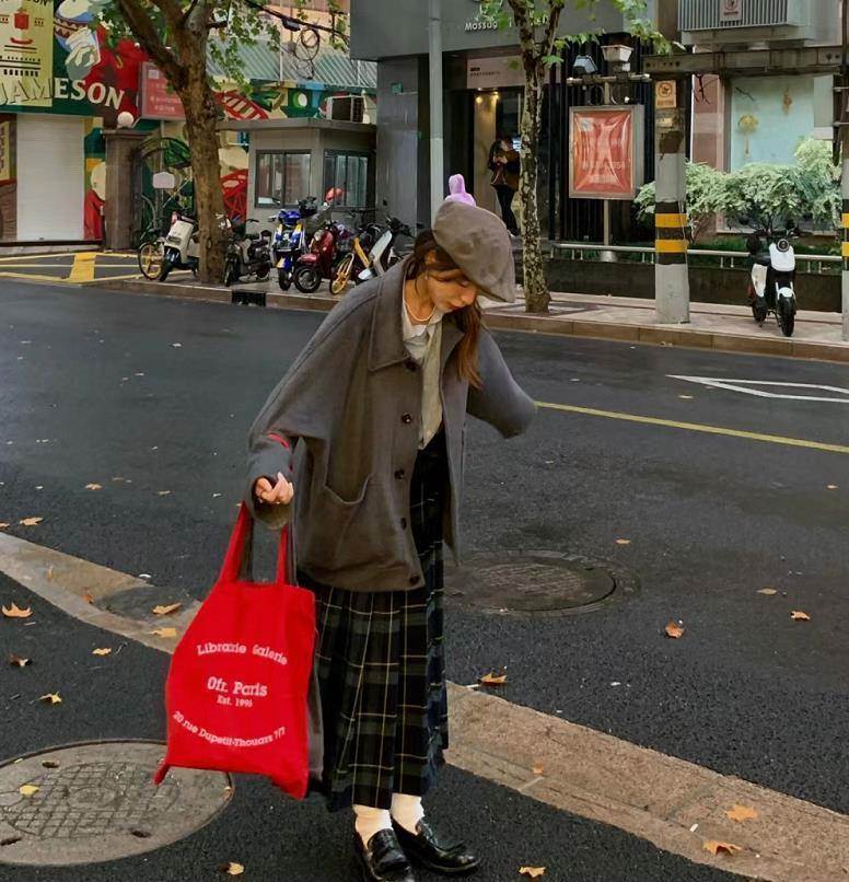 灰色毛呢外套+格紋半身長裙,這樣搭不僅顯復古還充滿了日系風,黑色小皮鞋點綴,讓整個著裝都充滿了時尚的味道。