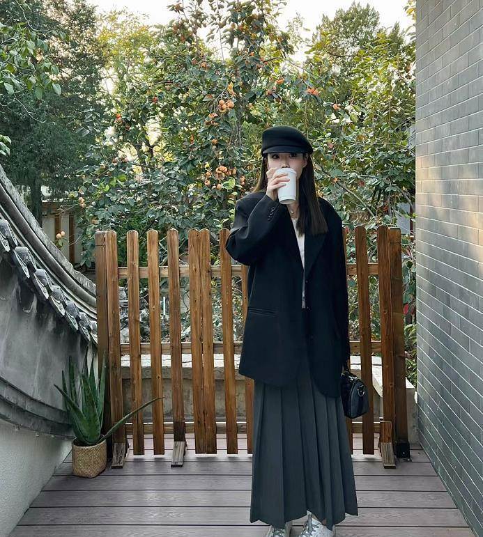 西裝外套搭配西裝半裙?很顯氣質干練的一套,只要西裝外套的版型選寬松一點, 就不用擔心會穿出過于呆板嚴謹的感覺。再混搭一雙運動鞋后,又多了幾分休閑。