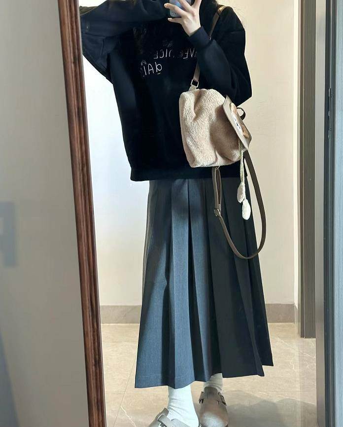 黑色衛衣+灰色百褶裙,才是南方秋日正確打開方式,當然,不是很冷的冬季也是可以這麼穿的。怕冷的姐妹,可以在裙子里加打底褲,這樣就更加保暖了。