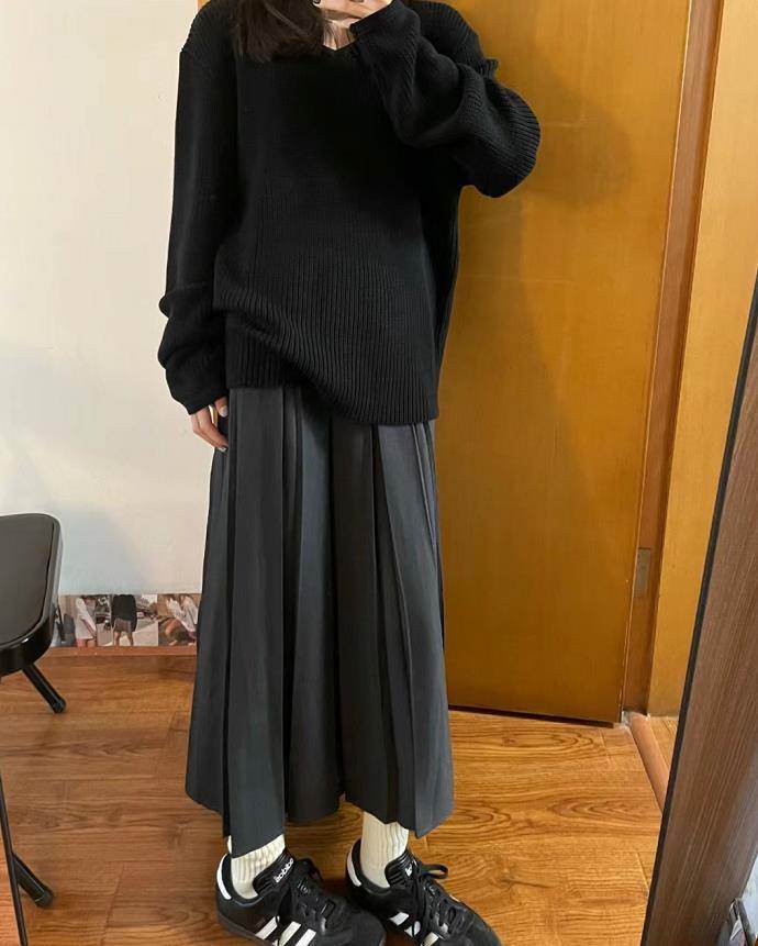 酷女孩就可以這麼穿,黑色基礎毛衣搭配灰色百褶半身長裙,黑白配色也太時髦好看了,怎麼都不會出錯。選擇一雙運動鞋來配吧,增加休閑感又好看。