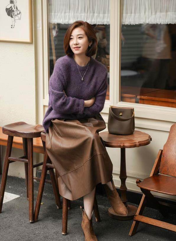 溫柔大姐姐風的穿搭,很實用漂亮,紫色的基礎款毛衣+棕色半身皮裙,小短靴的顏色與裙子一致,和諧又減少出錯。