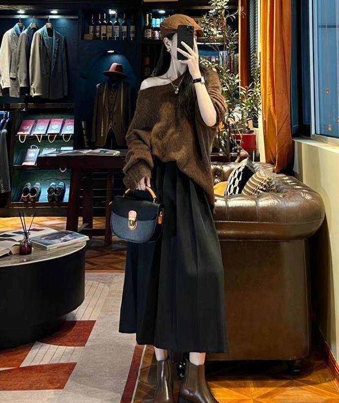 栗子色是我一直很喜歡的顏色,低調含蓄,自帶復古氣息,這件栗色毛衣真的很漂亮,顏色帶著滿滿的氛圍感,搭配黑色百褶半裙,減齡又時髦。