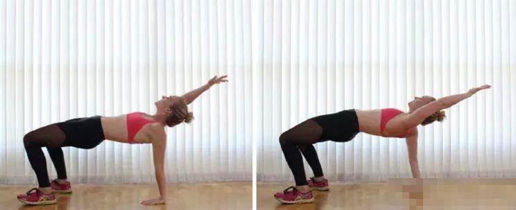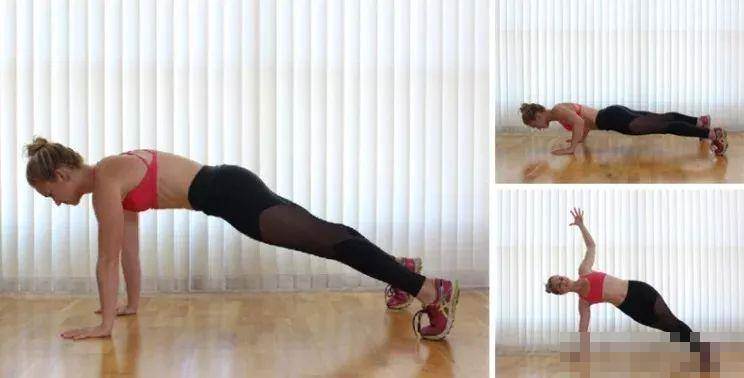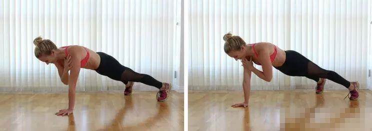 收腹,雙手同肩寬推地、手臂伸直 雙腳同肩寬、腳尖回勾點地、蹬腳跟 雙腿伸直,身體離地與地面成45度 脊柱延展、胸腔打開、雙肩放松 呼氣,右手離地、觸碰左肩 吸氣,右手還原撐地 呼氣,左手離地、觸碰右肩 吸氣,左手還原撐地 重復以上動作5-8次 ............................................................