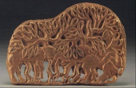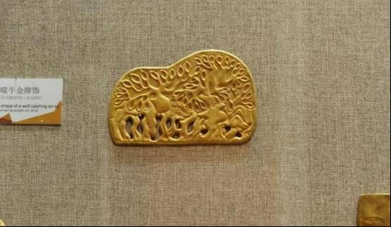 這塊被馬天福發現的金牌實際名為「匈奴狼噬牛金牌飾」,上面雕有牛和狼的圖案,以及作為背景的山和樹。從上面能夠看出那頭狼在后面追趕撕咬著牛,體現出弱肉強食的自然法則。