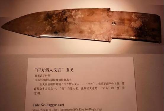 因為1976年在殷商墓葬婦好墓出土的「玉戈」,上面刻有「盧方皆可入戈五」的字樣,意思是盧方國向商王進獻了五柄玉戈。這同時也傳達出當時的盧方國和商朝保持著友好往來的歷史信息。