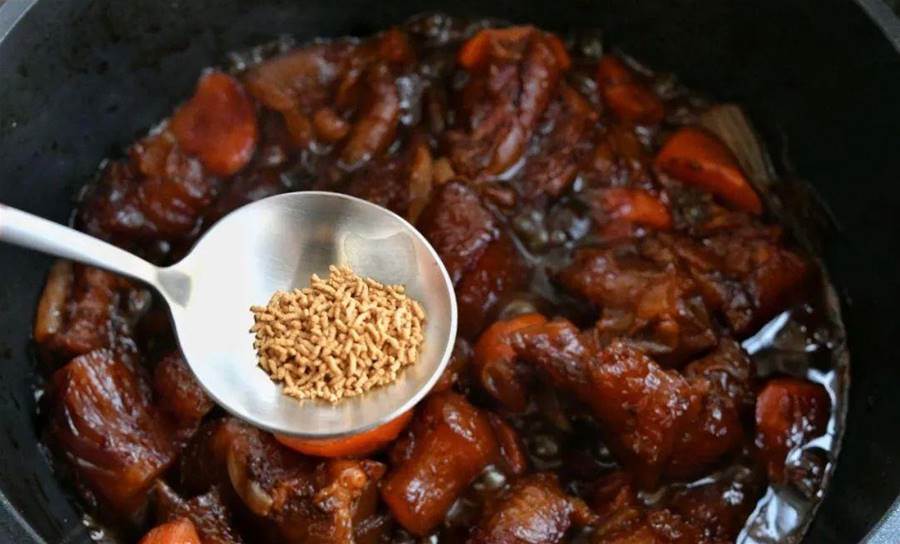 4、把胡蘿卜塊和洋蔥塊洗干凈以后切成塊兒加入鍋中,然后加入之前燉好的牛蹄筋,再加水和另外半罐紅燒汁沒過食材,一直燉煮到胡蘿卜完全軟嫩,再出鍋前加入一點鹽和雞精,用來提鮮,最后翻炒均勻就可以了。