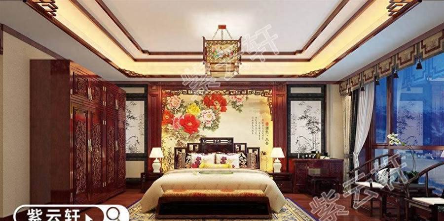 臥室,墻面選用淡色的墻紙搭配紅木邊框,簡潔中有品味,整體也很顯精致。開闊的臥室空間,依次做上一組紅木電視柜,主臥中還擺放地下梳妝台。床尾墻面用傳統古典畫搭配紅木花格,經典的中式裝修設計在小小的空間中大放異彩,盡顯傳統家居文化的獨到之處。
