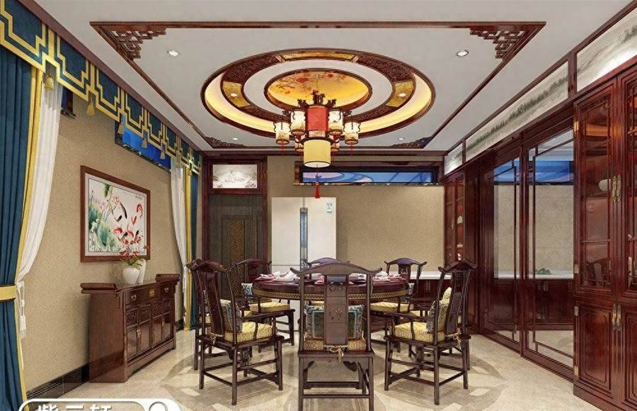 餐廳,廚房與餐廳是開放式設計,視覺效果敞亮又大氣。紅木圓桌搭配官帽椅,邊上還設計了一套紅木櫥柜,中式設計提高了碎片化空間的利用率,視覺效果也是不錯的。