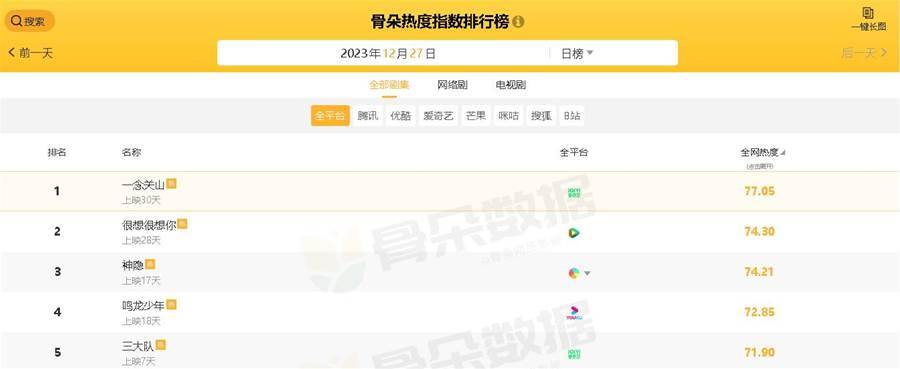 截至發文時間,從「骨朵熱度指數排行榜」數據顯示可知,當前熱播電視劇中,全網熱度最高的五部劇分別如下: