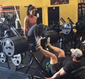 腿舉器械上幾乎掛滿了杠鈴片,上面還坐著一位女生,接近500KG的重量居然這麼輕松。