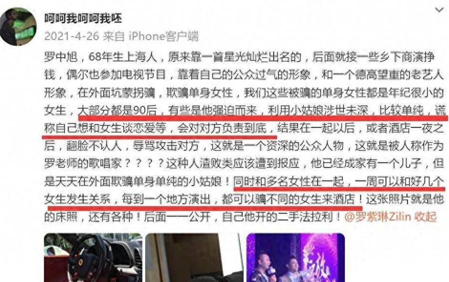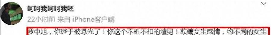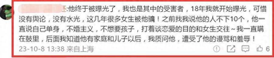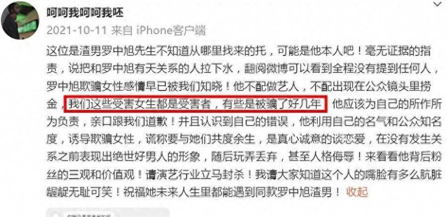 就在輿論譴責他的時候,一位自稱周放的網友在評論區表示,他也成為了羅中旭的犧牲品。周放表示,羅中旭多年來利用公眾人物的身份和演技欺騙了十多名單身女性的感情。