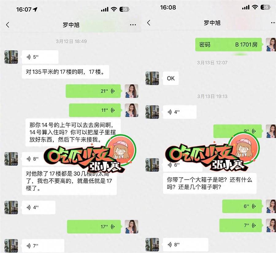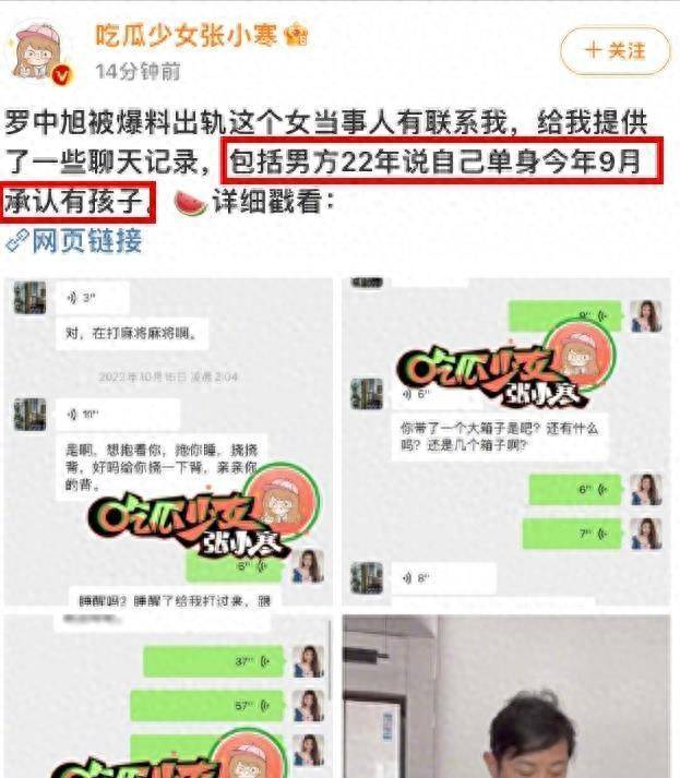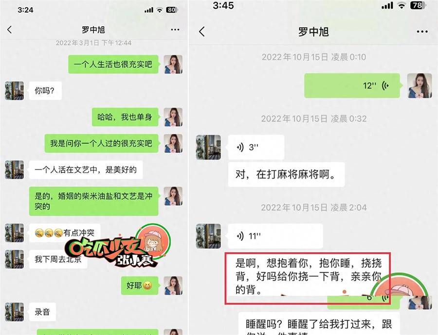 記者張曉涵透露,聊天記錄顯示,兩人從2022年3月開始聯系。羅中旭自稱單身后,兩人很快發展出戀愛關系。但羅中旭今年9月份才承認已經有了家庭。