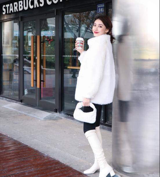 白色的羊羔毛外套搭配白色的及膝長靴,時尚大方又優雅,對小腿的拉長效果也是非常足,名媛風的氣質隨之到來,短款上衣搭配及膝長靴讓你的身高增加10cm不止,兼職是顯瘦、顯高的高級搭配。