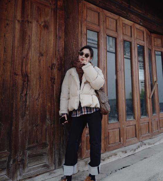 一件米色短款羽絨服搭配大地色系的圍巾和黑色直筒牛仔褲,整體造型上短下長,上淺下身,全身的層次感非常好,適合個子嬌小的女生,不但能夠顯高,一定程度上上身和下身的撞色新效果也能很好的優化自己的身材比例。