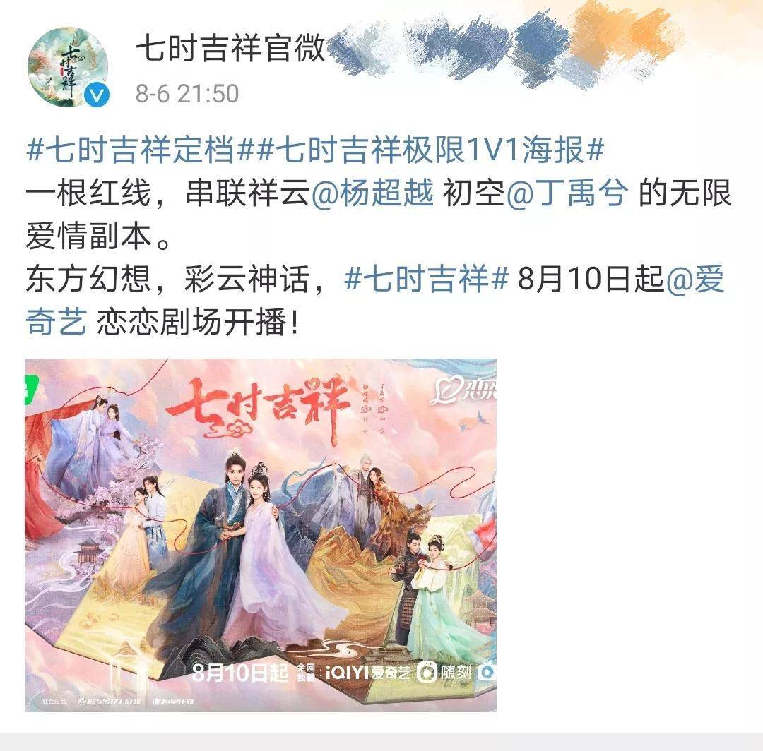 改編自九鷺非香的小說《一時沖動,七世不祥》的古裝神話輕喜劇《七時吉祥》,將于8月10日在愛奇藝播出,該劇由楊超越、丁禹兮、董璇等人主演,講述了小仙祥云(楊超越飾)和仙君初空(丁禹兮飾)兩人陰差陽錯牽系上古紅線,成為彼此綁定的歷劫仙侶后經歷的一系列浪漫歡樂又跌宕糾纏的七世情緣故事。