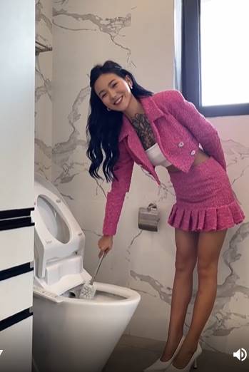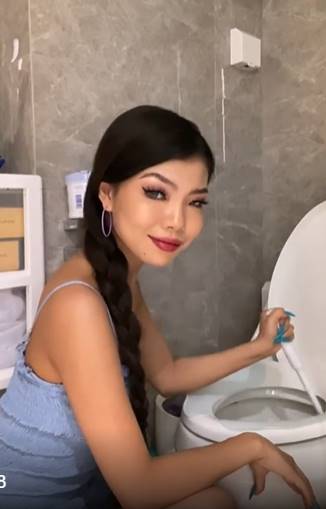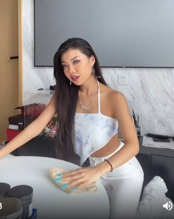 下一個瞬間,女孩立刻換上超辣平口背心、畫上全妝性感的擦著桌子!