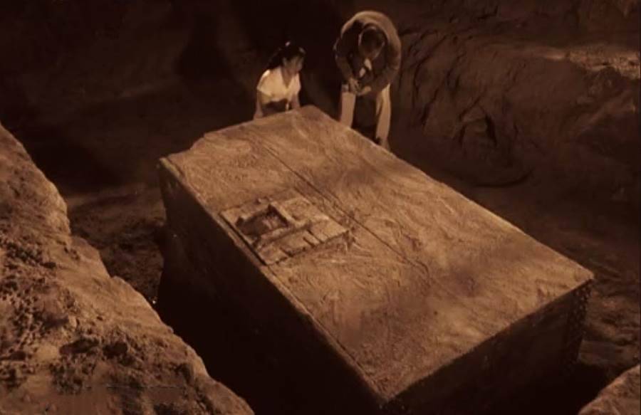 大家商量了一會兒,決定繼續往下挖,只不過動作變得小心謹慎起來。挖到大約80厘米深的時候,下方出現了一塊木板,將木板周圍的沙土清理干凈后,一個碩大的木箱露了出來。