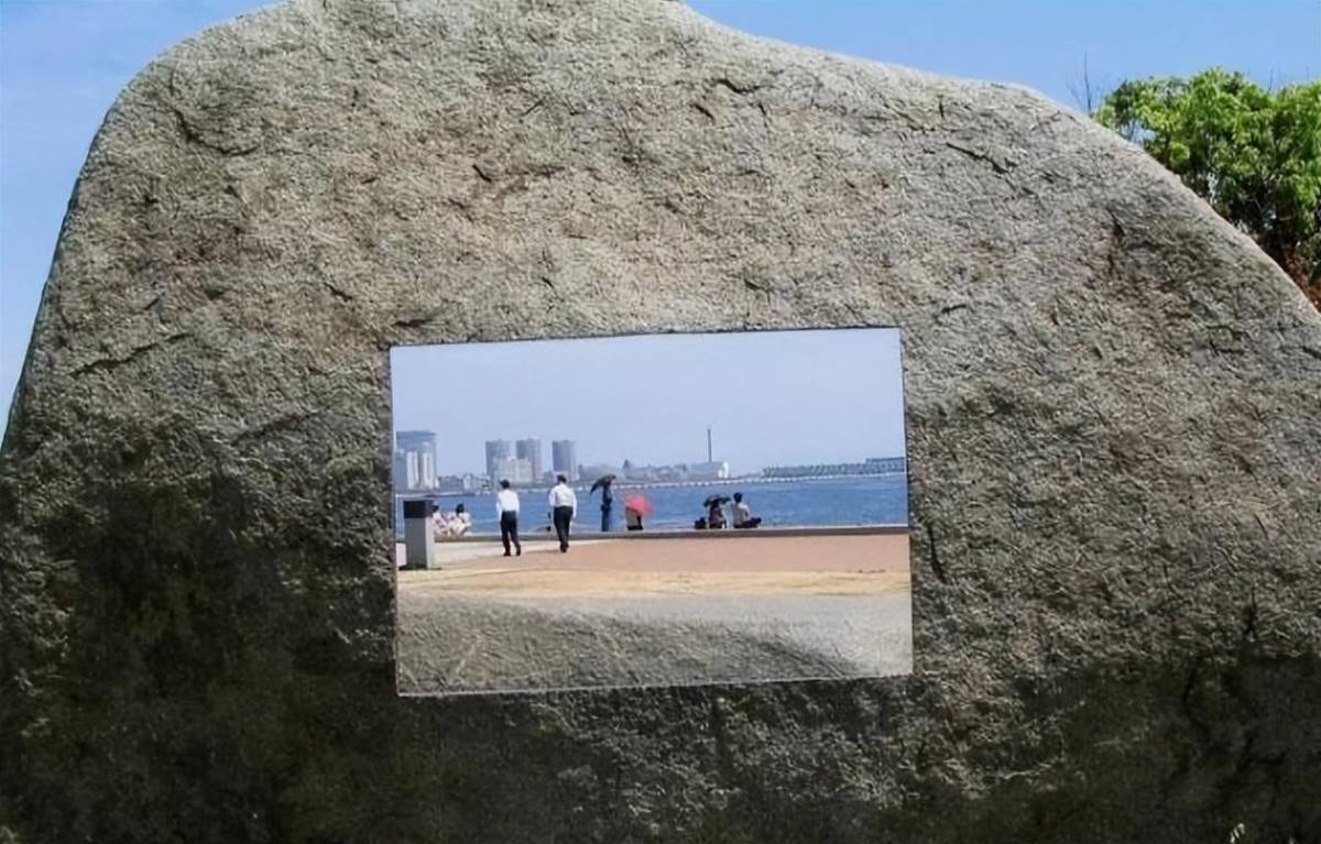 1、知道的還以為石頭上被掏出了一個方形的洞,但實際上是石頭上貼了一張海景照片!